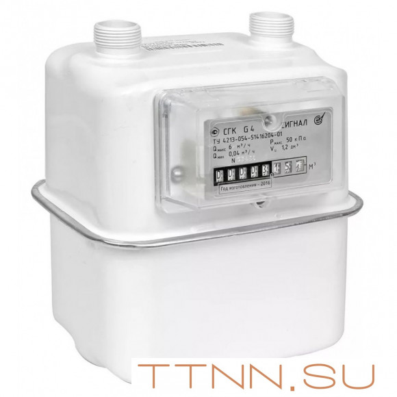 Счетчик газа Сигнал СГК-G4 Правый имеет штуцера с вертикальным расположением и расстоянием между ними 110 мм, а резьбой каждого патрубка равной G 1" (дюйм), что полностью соответствует по подключению и гарантирует взаимозаменяемость таких аналогов как СГК-4 ВОРОНЕЖ (Электроприбор) и КГ-4 БЕРЕСТЬЕ (Брест).