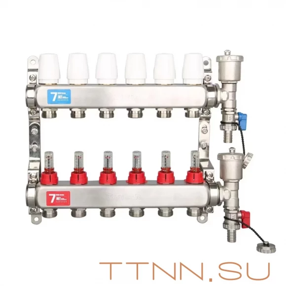 ViEiR Коллекторная группа, нержавеющая сталь 1" х 3/4", с расходомерами 8 выходов (5/1) VR113-08A. Артикул VR113-08A. Коллекторная группа применяется для передачи жидкости на контуры отопления и настройки в них мощности потока и температуры в системе "теплый пол", а также подключения радиаторов отопления, других тепловых приборов. Основные рабочие элементы это "две гребенки," - коллекторы подающего и обратного контура.