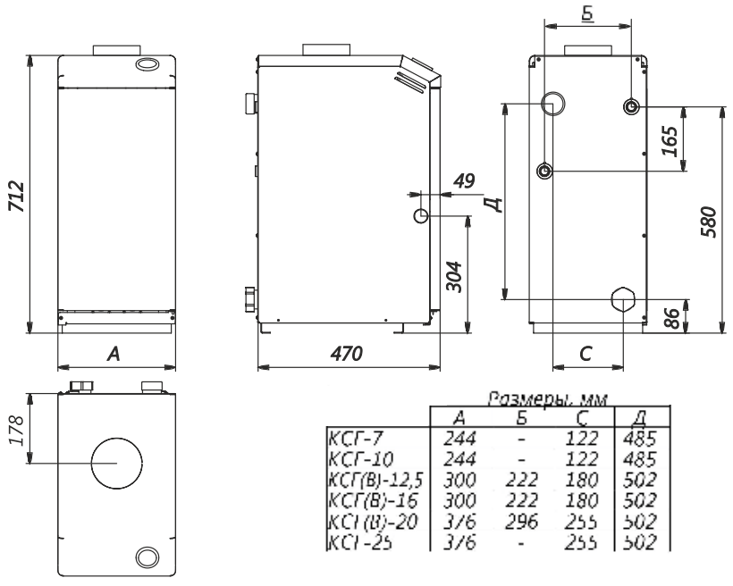 Габариты и присоединительные размеры отопительных аппаратов ОЧАГ Стандарт КСГ